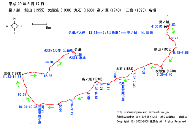 見ノ越 駐車地点 4:50 --剣神社 4:53 --西島リフト駅 5:23 -- 剣山 (5:48-5:56)--次郎笈 (6:29-6:40) ---スーパー林道下降点 7:08 --丸石 (7:22-7:33) ---丸石避難小屋 7:53 --奥祖谷かずら橋下降点 7:58 -荒廃した小屋跡 8:11--- 伊勢の岩屋への分岐標識 8:21---高ノ瀬 (8:36-8:48)--石立山分岐 9:06 --1732m地点 (9:34-9:49) --1700m三角点 10:04 --白髪避難小屋 10:21 --白髪山分岐 ( 10:29-10:36 )--カヤハゲ 10:57 --三嶺( 11:33-11:58 )--ダケモミの丘 分岐標識 12:36 ---平尾谷登山口 13:10 --名頃駐車場 13:36 ---- 名頃バス停 13:40