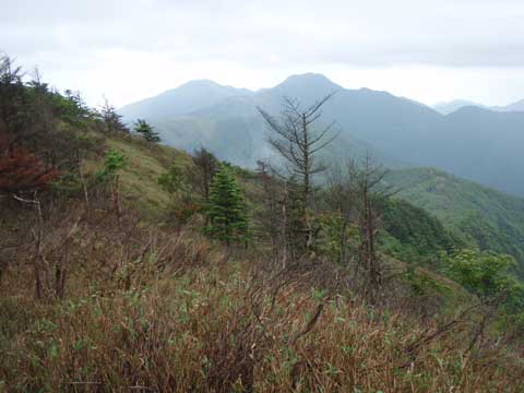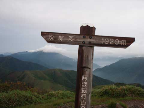 次郎笈 「14.7度 2m 西風 曇り 雨が上がった 三嶺山頂付近は雲がかかる。白髪 石立は見える。」
