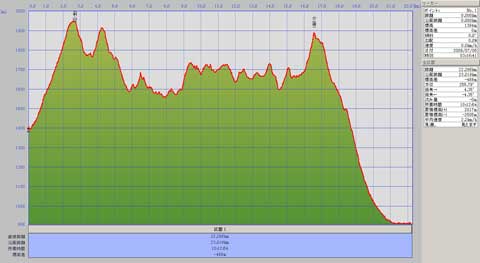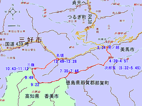 見ノ越 駐車地点 3:24 --剣神社 3:26 --西島リフト駅 4:02 -- 剣山 (4:39-4:51)--次郎笈 (5:32-5:45) ---スーパ−林道下降点 6:13 --丸石 (6:31-6:41) ---丸石避難小屋 6:57 --奥祖谷かずら橋下降点 6:59 -荒廃した小屋跡 7:11--- 伊勢の岩屋への分岐標識 7:22---高ノ瀬 (7:35-7:46)--石立山分岐 8:02 --1732m地点 (8:30-8:34) --1700m三角点 8:53 --白髪避難小屋 9:11 --白髪山分岐 9:22 --カヤハゲ 9:49 --三嶺( 10:43-11:12 )--三嶺ヒュッテ 11:20 --ダケモミの丘 分岐標識 11:52 ---平尾谷登山口 12:22 --名頃駐車場 (12:49-13:28) ---- 名頃バス停 13:30