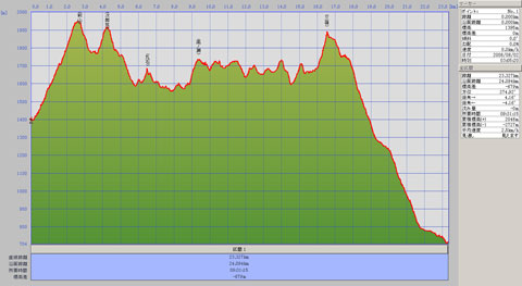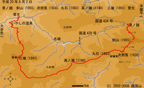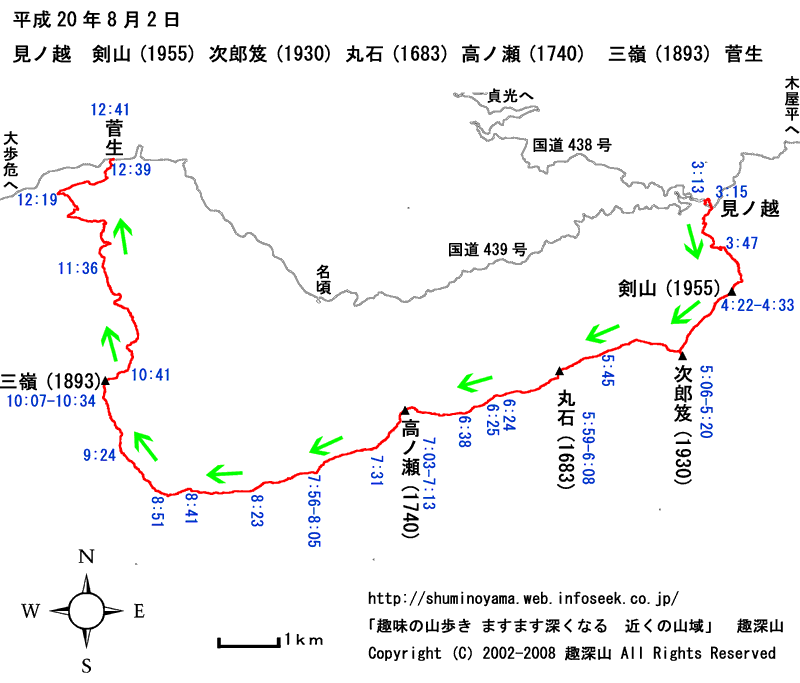 見ノ越 駐車地点 3:13 --剣神社 3:15 --西島リフト駅 3:47 -- 剣山 (4:22-4:33)--次郎笈 (5:06-5:20) ---スーパ−林道下降点 5:45 --丸石 (5:59-6:08) ---丸石避難小屋 6:24 --奥祖谷かずら橋下降点 6:25 -荒廃した小屋跡 6:38--- 伊勢の岩屋への分岐標識 6:48---高ノ瀬 (7:03-7:13)--石立山分岐 7:31 --1732m地点 (7:56-8:05) --1700m三角点 8:23 --白髪避難小屋 8:41 --白髪山分岐 8:51 --カヤハゲ 9:24 --三嶺( 10:07-10:34 )--菅生 下山道分岐標識 10:41 ---林業用作業小屋跡 11:36 -- いやしの温泉郷 12:19---菅生小学校 12:39 ---- 菅生バス停 12:41