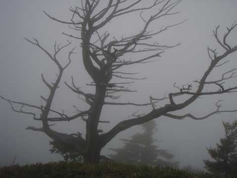 西熊山 「14.8度 3m 北風 ガス 何も見えず。」その後 視界が少し回復。