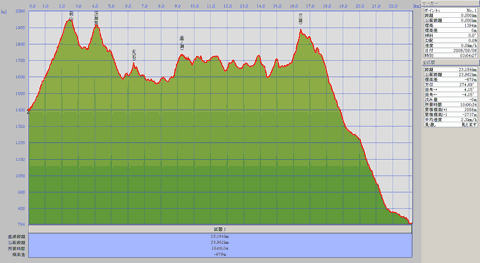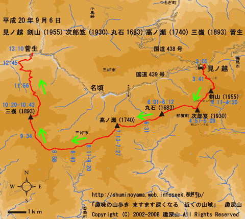 見ノ越 駐車地点 3:05 --剣神社 3:08 --西島リフト駅 3:41 -- 剣山 (4:11-4:20)--次郎笈 (4:57-5:09) ---スーパ−林道下降点 5:45 --丸石 (6:01-6:12) ---丸石避難小屋 6:31 --奥祖谷かずら橋下降点 6:33 -荒廃した小屋跡 6:47--- 伊勢の岩屋への分岐標識 6:58---高ノ瀬 (7:13-7:27)--石立山分岐 7:47 --1732m地点 (8:11-8:20) --1700m三角点 8:40 --白髪避難小屋 8:58 --白髪山分岐 9:07 --カヤハゲ 9:34 --三嶺( 10:20-10:43 )---三嶺ヒュッテ 10:55---菅生 下山道分岐標識 10:58 ---林業用作業小屋跡 11:56 -- いやしの温泉郷 12:45---菅生小学校 13:06 ---- 菅生バス停 13:10