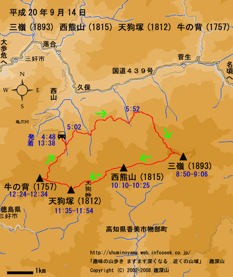 西山林道 駐車地点出発 4:48---西山林道イザリ峠登山口 5:02--- ふるさと林道阿佐名頃線から取付 5:52 --1806m標高点 (8:21-8:25) --縦走路にでる 8:39-- 三嶺 (8:50-9:06) ---西熊山 (10:10-10:25) --お亀岩 10:43 --天狗峠 綱附森分岐 11:13 --天狗峠西山林道分岐 11:19---天狗塚山頂 ( 11:35-11:54 )--牛の背三角点 (12:24-12:34) ----西山林道 13:34 ----- 西山林道 駐車地点P地点着 13:38