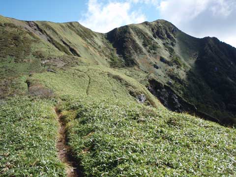 三嶺を振り返る、ササの斑点が大きくなってきたのが気になる。。