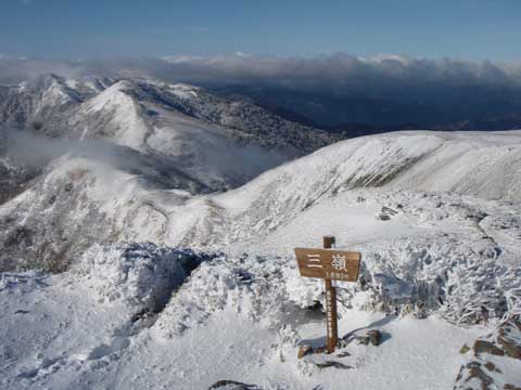 三嶺 「-8.6度 5m 北東風 晴れ。剣山 次郎笈 西熊山見える。天狗塚はガスがかかる。」