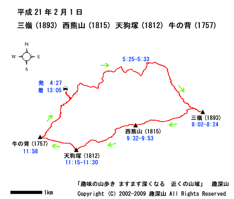 HOME > 山行記録 >三嶺(1893) 西熊山(1815) 天狗塚(1812) 牛ノ背(1757) > 平成21年2月1日