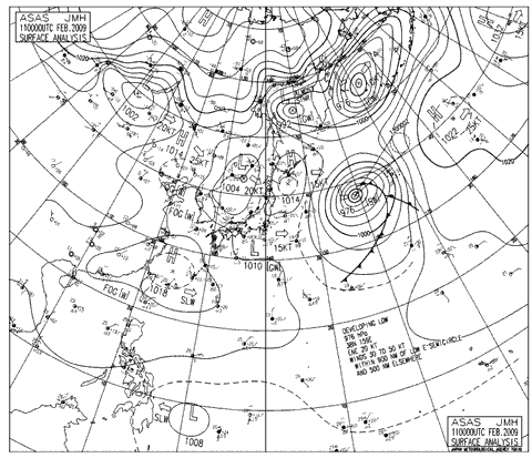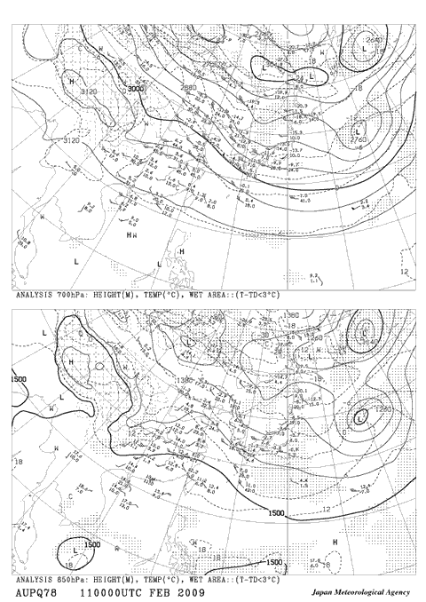 平成21年2月11日9時 高層天気図 700hPa 850hPa