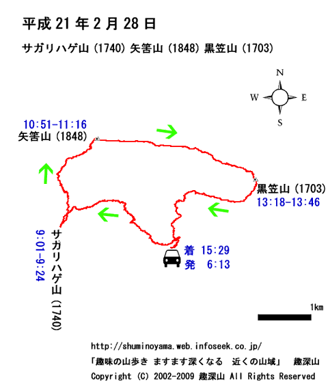 平成21年2月28日サガリハゲ山(1740) 矢筈山(1848) 黒笠山(1703)
