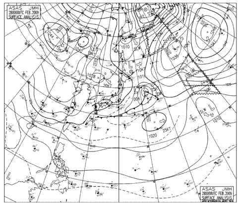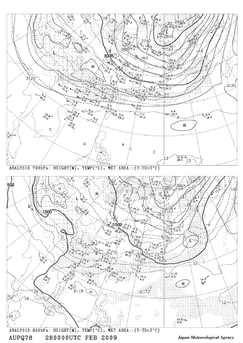 平成21年2月28日9時 高層天気図 700hPa 850hPa