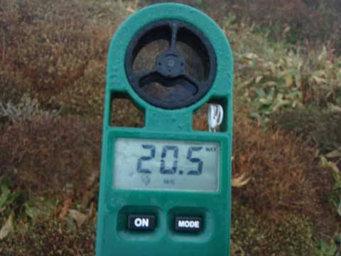 三嶺山頂 「10.2度 南西風 6m 風雨 ガス 何も見えず。」