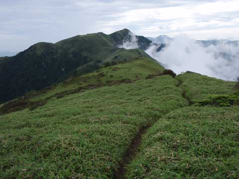 西熊山 「17.4度 曇り 南風 4-5m ガスが南から湧きあがる。三嶺、次郎笈まで見えるが 天狗塚はガスがかかる。」