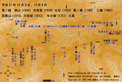 見ノ越 駐車地点発 10月3日23:03 --剣神社 23:05 --西島リフト駅 23:46 -- 剣山 10月4日(0:17-0:24)--次郎笈 (1:04-1:09) ---スーパ−林道下降点 1:40 --丸石 (1:56-2:06) ---丸石避難小屋 2:25 --奥祖谷かずら橋下降点 2:27 -荒廃した小屋跡 2:42--- 高ノ瀬 (3:10-3:22)--石立山分岐 3:39 --1732m地点 4:10 --1700m三角点 4:33 --白髪避難小屋 (4:54-5:13) --白髪山分岐 5:23 --カヤハゲ 5:58 --三嶺( 6:43-7:11 )-----西熊山 (8:12-8:28) --お亀岩 8:44 --天狗峠 綱附森分岐 9:04 --天狗峠西山林道分岐 9:10---天狗塚山頂 ( 9:25-9:52 )-- 牛の背三角点 (10:24-10:27) ----西山林道 11:47 --西山--- 大宮橋 12:43 ----久保バス停着 12:45