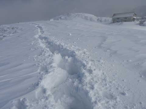 三嶺 「マイナス11.5度 西風9m 曇り 西熊山 天狗塚 綱附森 土佐矢筈見える 剣山 次郎笈は見えない。 」