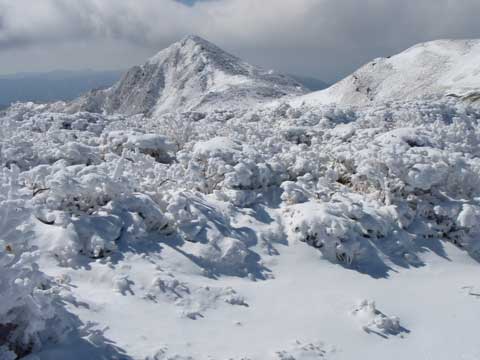 三嶺 「-8.4度 北風 3-4m ガス 小雪。 視界無し」