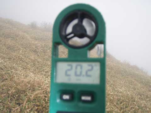 三嶺 「+4.6度 南西風 12m 曇り ガス。何も見えず」