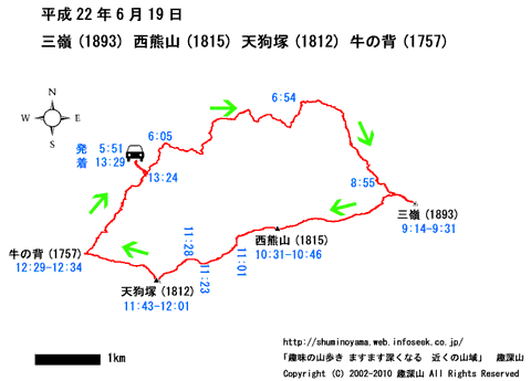 西山林道 駐車地点出発 5:51--西山林道イザリ峠登山口 6:05-- ふるさと林道阿佐名頃線から取付点 6:54 --1806m標高点 8:55 --縦走路にでる 9:06-- 三嶺 (9:14-9:31) ---西熊山 (10:31-10:46) --お亀岩 11:01 --天狗峠 綱附森分岐 11:23 --天狗峠西山林道分岐 11:28---天狗塚山頂 ( 11:43-12:01 )-- 牛の背三角点 (12:29-12:34) ---西山林道 13:24 -- 西山林道 駐車地点P地点着 13:29