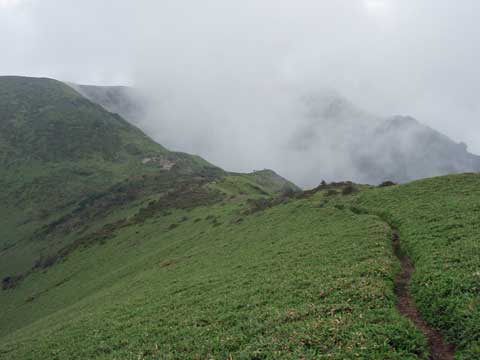 三嶺 「17.5度 5m 南西風 ガス 何も見えず。」