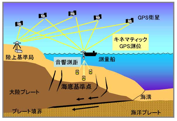 沖合でのプレートの動きを的確に察知することで 地震発生の解明を目指しています。海上保安庁のHPより引用