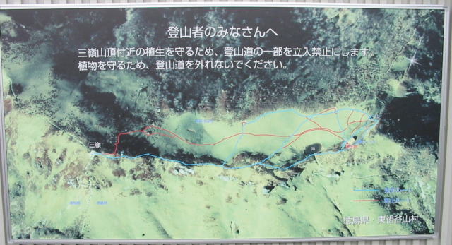 植生保護のため いくつかの登山道を 立ち入り禁止にした 看板が 三嶺ヒュッテにある。
