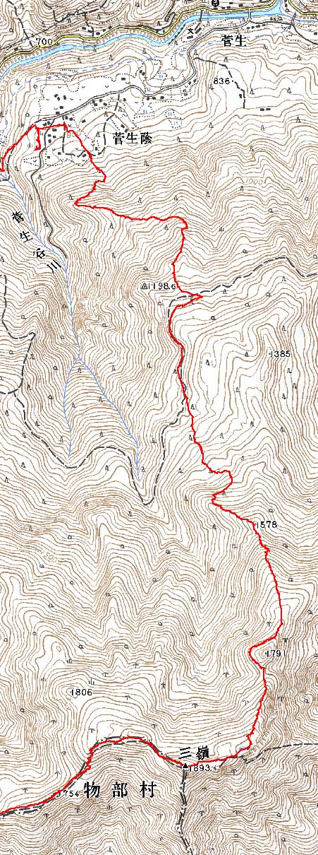 三嶺山頂 から 菅生 いやしの温泉郷 (旧 青少年旅行村) 間 の 登山道(GPSトラックログによる)
