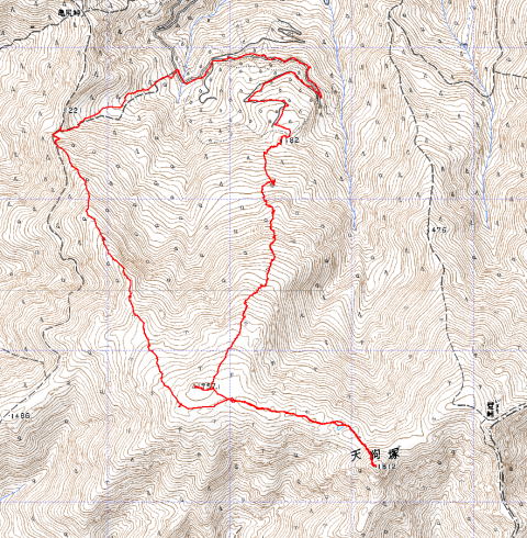 西山林道駐車地点 6:58 -- 牛の背三角点 10:00 -- 天狗塚 (10:54 -11:56)--樹林限界12:44-- 西山林道 13:38--駐車地点13:56