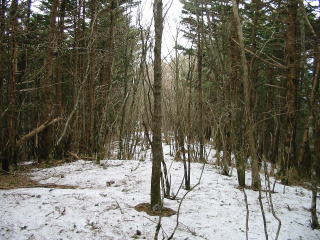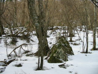 1182p まで藪のなかを縫っていき、人工林の中に入り 高度を上げていくと、北側斜面だけあって だんだん残雪が出てきた。