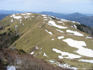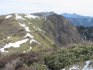 樹林帯の中 残雪 天狗塚 まだら模様 牛の背 左より 天狗峠 西熊山 三嶺 剣山 次郎笈 牛の背 北西面 樹林帯 の残雪