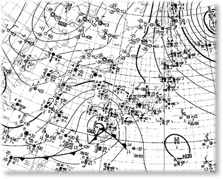 上は南岸低気圧の例で、1994年2月11日21時の天気図です。