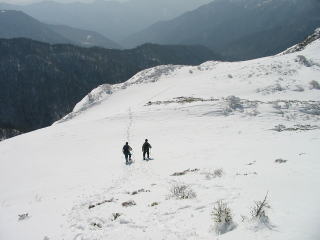 三嶺 西峰の南斜面あたりで 2人組 2パーティーに出会う。高知県側の光石からフスベヨリ谷経由お亀岩への縦走のようだ。南斜面は 風がブロックされ 日ざしが春のようで 暖かい。
