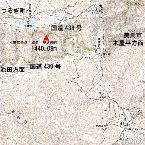世界測地系(測地成果2000) 種別 四等三角点 点名 見ノ越西 緯度 33°52′11″.0383 経度 134°4′47″.1717 標高 1440.08m ジオイド高 38.87m