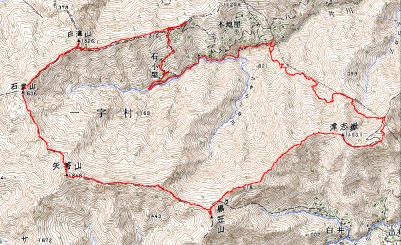 半田町 大惣 木地屋線 7:31 --石堂神社 7:54 -- 白滝山 9:00 -- 石堂山 9:48 -- 矢筈山 (11:08-11:27) -- 黒笠山 (13:32-14:00) -- 津志嶽 16:06 -- 161番鉄塔 17:50 -- 県道木地屋赤松線 19:15 -- 木地屋 20:15 -- --石堂神社 21:04 -- 半田町 大惣 木地屋線 21:25