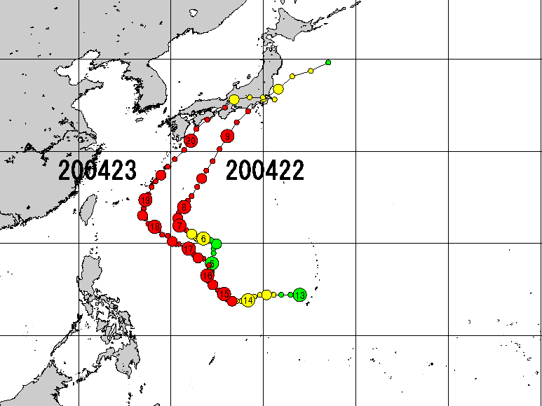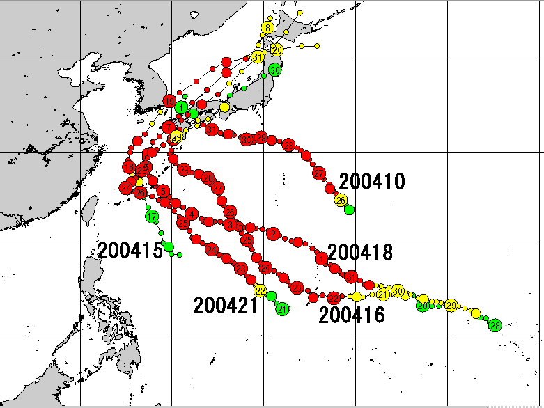 台風番号 名前 地域 発生日時 (UTC) 消滅日時 (UTC) 寿命 最低気圧 22号 200422 MA-ON 北西太平洋 2004-10-04 03:00 2004-10-10 00:00 5日21時間 920 23号 200423 TOKAGE 北西太平洋 2004-10-13 00:00 2004-10-21 00:00 8日0時間 940