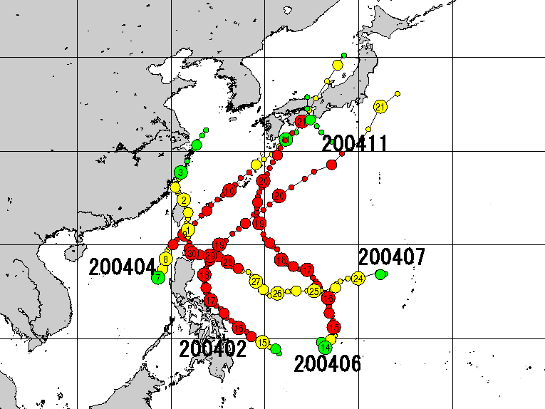 台風番号 名前 地域 発生日時 (UTC) 消滅日時 (UTC) 寿命 最低気圧 2号 200402 NIDA 北西太平洋 2004-05-14 06:00 2004-05-21 06:00 7日0時間 930 4号 200404 CONSON 北西太平洋 2004-06-07 00:00 2004-06-11 06:00 4日6時間 960 6号 200406 DIANMU 北西太平洋 2004-06-13 12:00 2004-06-21 18:00 8日6時間 915 7号 200407 MINDULLE 北西太平洋 2004-06-23 06:00 2004-07-04 00:00 10日18時間 940 11号 200411 MALOU 北西太平洋 2004-08-04 03:00 2004-08-04 21:00 0日18時間 994