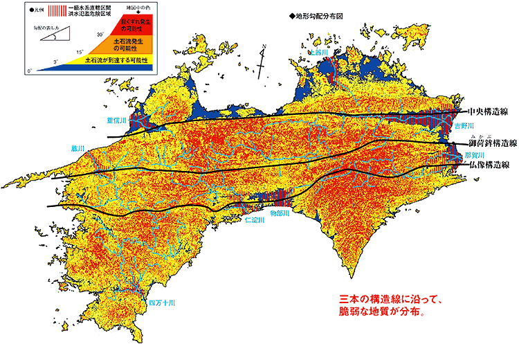 「四国地方は、中央部を東西に四国山地が連なり、山がちで急峻な地形が続きます。また、構造線が横断しこれに沿って脆弱な地質が分布することから土砂災害の危険区域が極めて多い。一方、川沿いに開けた平野部は水害に対する危険地帯となっています。山地部も平野部もその殆どが危険地帯なのです。」