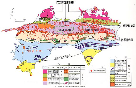 「三波川帯及び御荷鉾帯は、日本でも有数の地すべり地帯となっている。地すべりは片理面が発達した泥質片岩や御荷鉾型緑色岩の流れ盤に多発している。また、大規模崩壊による崩積土斜面に多発している。地すべり地形は特定の断層破砕帯や褶曲構造に関連して分布すると言うよりも、むしろ主要河川に沿って分布する傾向が見られる。」
