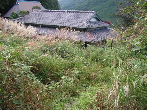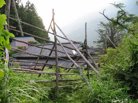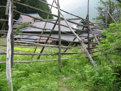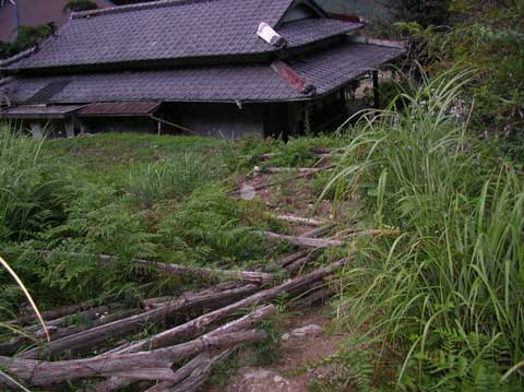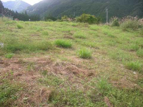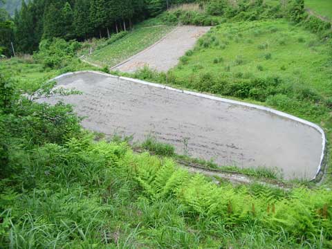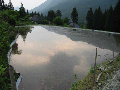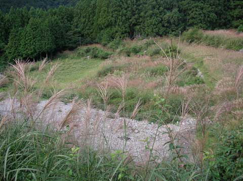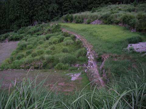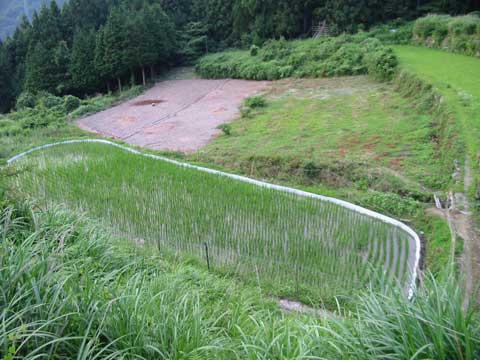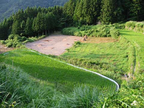 三嶺山頂から菅生の いやしの温泉郷へ下ってくると、傾斜地の段々の耕作地に水田があった。