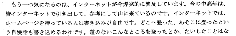 また 急激に増えてきた 登山者にたいし、多くの情報を、過度に情報過多といえるような状態で、 親切心があだとなっている懸念もあります。