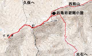 平成16年9月の台風16号、18号の二つの台風でお亀岩避難小屋が破損しました。