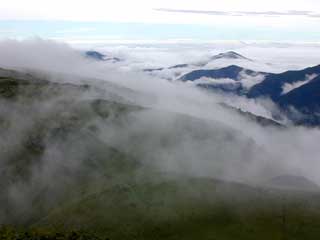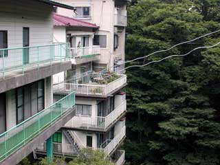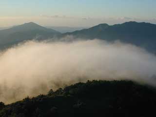 かつての林業最盛期に比べ 著しく衰退した。普段と違い 水流が 多くなるとき がある 谷の下から 傾斜地に 建てられた高層棟 霧に覆われる谷間 霧が山稜にかかる